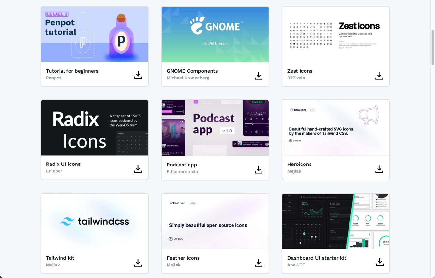 PenPot builds a community together. Your work and knowledge can be useful to someone else, even if you think otherwise. Here you can share your libraries and templates and download the ones you like.![]()